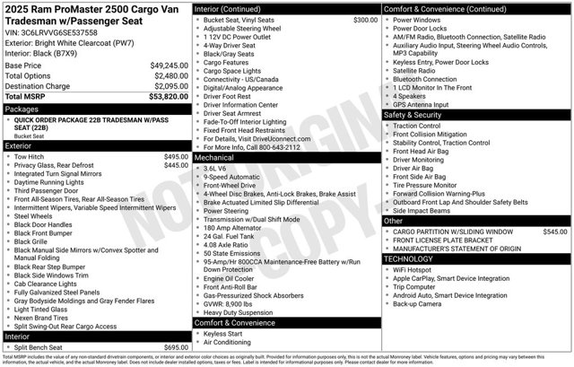 Discover the ultimate work vehicle in the 2025 Ram ProMaster 2500 Base. Designed with the modern professional in mind, this versatile cargo van offers unparalleled capability and convenience to streamline your business operations. Black, Vinyl Bucket Seats Passenger Double Seat Rear Hinged Doors with Fixed Glass Class IV Receiver Hitch Cargo Partition with Sliding WindowThis ProMaster 2500 is equipped with a powerful 3.6L V6 engine and a smooth shifting 9 speed automatic transmission, delivering the performance you need to tackle any job. With a mere 1 mile on the odometer, this van is primed and ready to become your trusted workhorse.Beyond its impressive powertrain, the ProMaster 2500 Base boasts an array of thoughtful features to enhance your driving experience. Enjoy the convenience of remote keyless entry, steering wheel mounted audio controls, and a ParkView Rear Back Up Camera for effortless maneuvering. Stay connected with the Uconnect 5 infotainment system, complete with a 7 inch display, SiriusXM Radio, and Apple CarPlay/Android Auto compatibility.For your safety and peace of mind, this ProMaster 2500 is equipped with advanced technologies like Electronic Stability Control, Traction Control, and Brake Assist. The Heavy Duty Suspension and 4 Wheel Disc Brakes ensure a smooth, confident ride, even when fully loaded.Designed with the needs of professionals in mind, the 2025 Ram ProMaster 2500 Base is the ultimate work companion. Experience the uncompromising performance, versatility, and technology that will elevate your business to new heights. Contact us today to schedule a test drive and discover how this exceptional cargo van can transform the way you work.