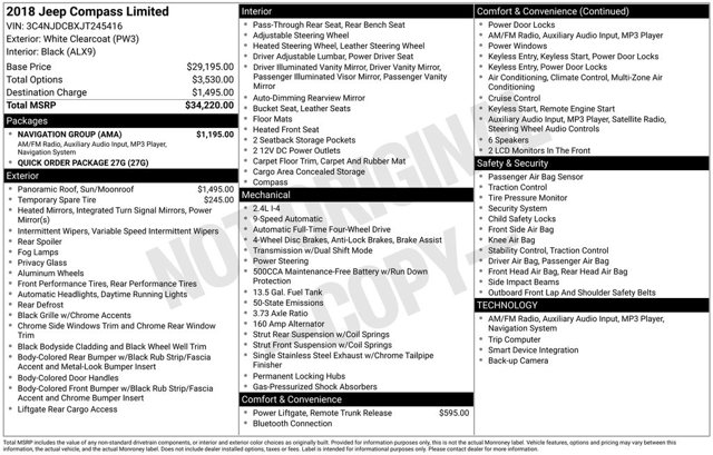 Discover the perfect blend of capability, technology, and style with this 2018 Jeep Compass Limited. This exceptional SUV is ready to elevate your driving experience and take you on remarkable adventures. Power Front/Fixed Rear Full Sunroof Navigation Group with Uconnect 4C Nav and 8.4 Display Power LiftgateThis Compass Limited is equipped with an impressive array of features that cater to your every need GPS Navigation Radio Uconnect 4C Nav w/8.4 Display Air Conditioning Automatic Temperature Control Front Dual Zone A/C Rear Window Defroster Power Driver Seat Power Steering Power Windows Remote Keyless Entry Steering Wheel Mounted Audio Controls Traction ControlBeneath the sleek exterior, this Compass is powered by a 2.4L I4 engine paired with a 9 Speed Automatic transmission and 4WD, delivering an exceptional blend of performance and efficiency with an EPA estimated 22 MPG in the city and 30 MPG on the highway.Designed to impress, the Compass Limited boasts a striking White exterior and a spacious, well appointed interior that seamlessly combines comfort and convenience. From the available Quick Order Package 27G to the Compact Spare Tire, this vehicle is meticulously equipped to exceed your expectations.Experience the thrill of driving the 2018 Jeep Compass Limited. With its impressive capabilities, advanced technology, and refined style, this SUV is the perfect companion for your next adventure. Visit our showroom today and let us demonstrate why this Compass is the perfect fit for you.