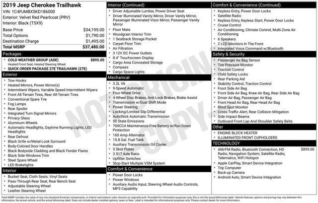 Experience the ultimate off road adventure with this stunning 2019 Jeep Cherokee Trailhawk. Boasting a powerful 3.2L V6 engine and 4 wheel drive capabilities, this rugged SUV is ready to conquer any terrain you encounter. Adorned in a bold, eye catching red exterior, this Trailhawk model is equipped with a wealth of premium features that elevate your driving experience.Highlights of this Jeep Cherokee Trailhawk include Cold Weather Group Includes an engine block heater, heated steering wheel, windshield wiper de icer, and heated front seats for optimal comfort in colder climates. Uconnect 4C NAV with 8.4 Display Enjoy seamless connectivity, navigation, and entertainment with this state of the art infotainment system. SiriusXM Traffic Plus and Travel Link Service Stay informed and entertained with real time traffic updates, weather forecasts, and more. 4G LTE Wi Fi Hotspot Keep your passengers connected on the go with a built in Wi Fi hotspot. Hill Descent Control Tackle steep, challenging terrain with confidence thanks to this advanced off road feature. ParkView Rear Back Up Camera Maneuver with ease and park with precision, even in tight spaces.This Jeep Cherokee Trailhawk is not just a capable off road companion it s also a refined and comfortable daily driver. With its spacious interior, ample cargo room, and a host of advanced safety technologies, this SUV is ready to elevate your driving experience, whether you re navigating the urban jungle or exploring the great outdoors.Discover the perfect blend of ruggedness and sophistication with this 2019 Jeep Cherokee Trailhawk. Schedule a test drive today and experience the thrill of owning this exceptional vehicle.