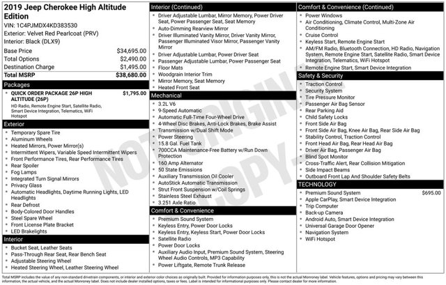 Elevate your driving experience with this stunning 2019 Jeep Cherokee Limited. This versatile SUV combines exceptional performance, advanced technology, and premium comfort, making it the perfect companion for your adventures. QUICK ORDER PACKAGE 26P HIGH ALTITUDE 9 AMPLIFIED SPEAKERS W/SUBWOOFER GPS Navigation High Altitude Package 4G LTE Wi Fi Hot Spot SiriusXM Traffic Plus and SiriusXM Travel Link Granite Crystal Exterior Accents and Badging Anodized Gun Metal Interior Accents Tungsten Interior Accent StitchingUnder the hood, the 3.2L V6 engine and 9 speed automatic transmission deliver a powerful and efficient performance, with an impressive 27 highway MPG. The Jeep Cherokee s renowned 4WD capability ensures you can conquer any terrain with confidence, while the advanced safety features, including multiple airbags and electronic stability control, provide peace of mind.Step inside and you ll be surrounded by premium amenities, from the heated steering wheel and front seats to the Uconnect 4C infotainment system with an 8.4 inch touchscreen display. Enjoy seamless connectivity with Apple CarPlay, Android Auto, and a 4G LTE Wi Fi hotspot, keeping you entertained and connected on the go.The Jeep Cherokee Limited s striking exterior design, with its bold grille, sleek lines, and distinctive Granite Crystal accents, commands attention wherever you go. The available roof rails and power liftgate add both style and functionality, making it easy to load up your gear for your next adventure.Whether you re commuting to the office or embarking on a weekend getaway, this 2019 Jeep Cherokee Limited is the perfect blend of capability, technology, and luxury. Experience the difference for yourself and schedule a test drive today. We re confident you ll be impressed by this exceptional SUV.