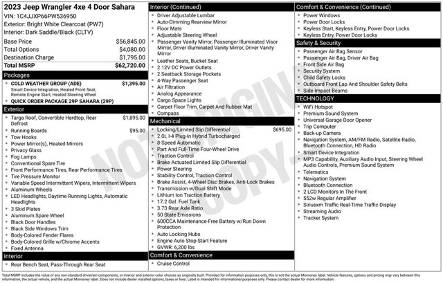 Discover the ultimate blend of power, efficiency, and adventure with the 2023 Jeep Wrangler Sahara 4xe. This remarkable SUV seamlessly combines the iconic Wrangler design with the latest in hybrid technology, delivering an unparalleled driving experience.Tailored to the discerning driver, this Wrangler Sahara 4xe boasts a host of premium features that elevate your journey Cold Weather Group Enjoy the comfort of a heated steering wheel and front seats, along with a convenient remote start system. Anti Spin Differential Rear Axle Conquer any terrain with enhanced traction and control. Black 3 Piece Hard Top Easily transition between open air freedom and weather protected security. Side Steps Access your Wrangler with ease and style.Beyond these standout features, this Wrangler Sahara 4xe is packed with an impressive array of technology and creature comforts. Indulge in the convenience of a navigation system, Apple CarPlay/Android Auto, and a premium audio system with 9 speakers. Stay connected and entertained throughout your adventures.Designed for the modern adventurer, the Wrangler Sahara 4xe seamlessly blends rugged capability with refined luxury. The 2.0L I4 DOHC engine, paired with an 8 speed automatic transmission and 4 wheel drive, delivers the power and performance you demand, while the hybrid system enhances efficiency and reduces your environmental impact.Whether you re tackling the great outdoors or navigating the city streets, this Wrangler Sahara 4xe is the ultimate companion. Its striking white exterior, complemented by the sleek black accents, exudes a bold and confident presence that is sure to turn heads.Experience the unrivaled combination of style, technology, and capability that the 2023 Jeep Wrangler Sahara 4xe has to offer. Visit our showroom today and let us demonstrate how this remarkable SUV can elevate your driving experience to new heights.